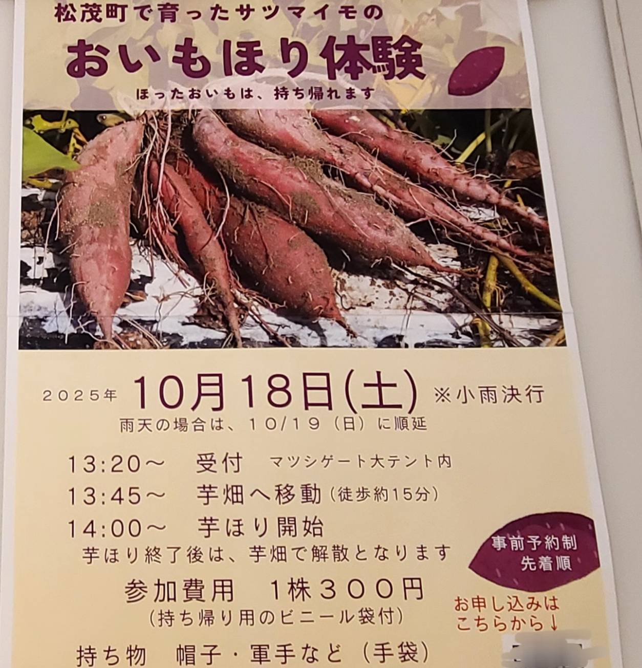 13:20~受付(マツシゲート大テント内)。13:45~芋畑へ移動(徒歩約15分)。14:00~芋ほり開始。参加費用は1株300円(持ち帰り用のビニール袋付き)。持ち物は帽子、軍手など。