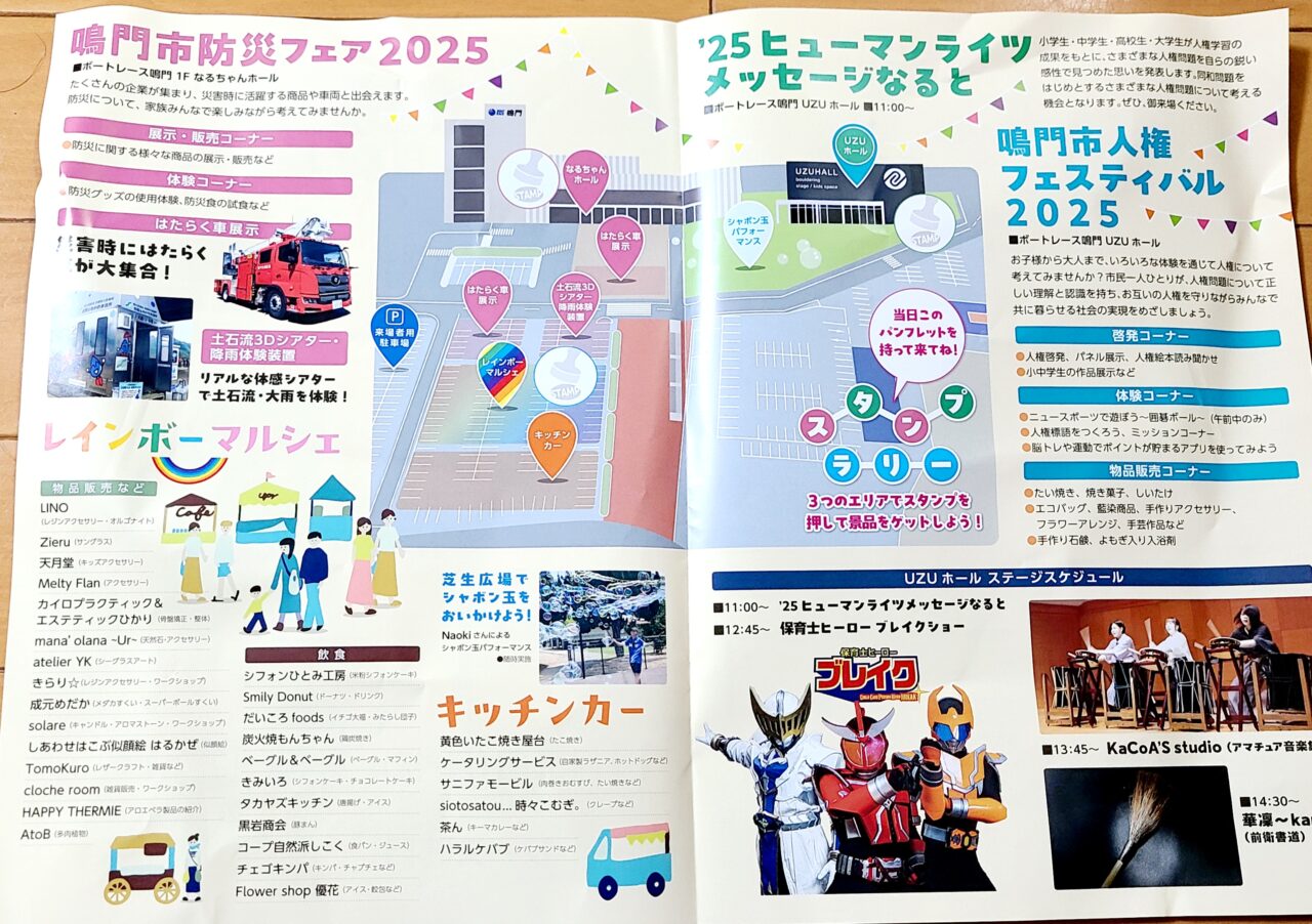 鳴門市防災フェア 2025 鳴門市人権フェスティバル 2025  '25 ヒューマンライツメッセージなると開催当日は、レインボーマルシェやキッチンカーの出店もあるようです。「ボートレース鳴門内 ウズホール」ではステージイベントで、「保育士ヒーロー ブレイクショー」も行われます。