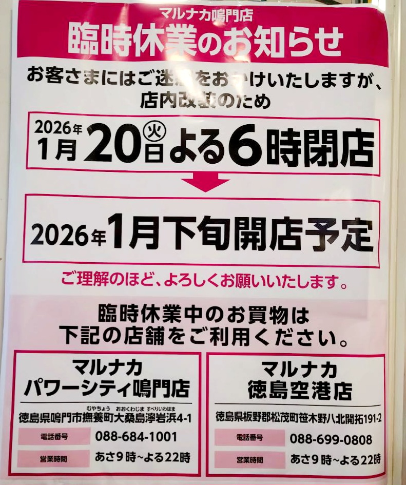 「マルナカ 鳴門店」が店舗改装工事のため臨時休業するようです。