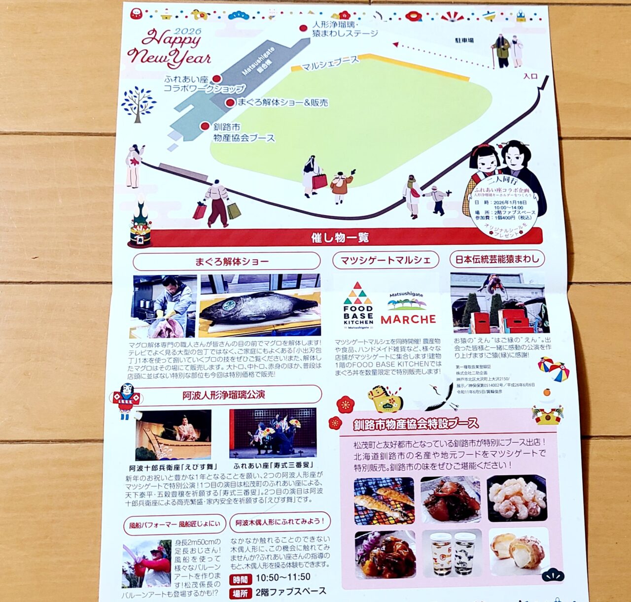 マツシゲートお魚フェア&釧路フェアinマツシゲートマルシェまた、人形浄瑠璃芝居の公演や日本伝統芸能の猿回しも行われます。縁起のいい芸と言われる猿回しや、新年のお祝いと豊かな一年を祈願して人気浄瑠璃が披露されるそうです。