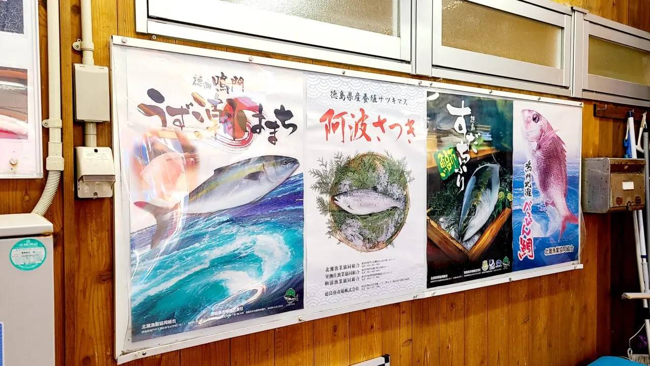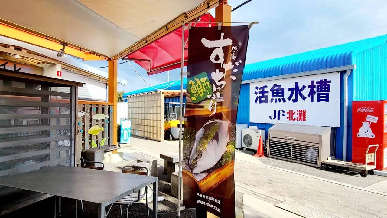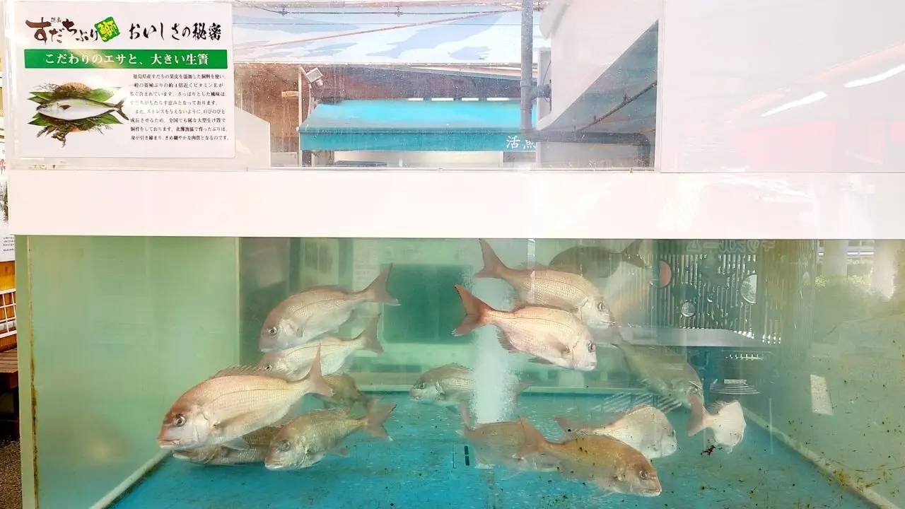 食堂も併設しており、新鮮でおいしそうな鯛やすだちぶりの刺身、定食、天ぷら、煮魚等も楽しめます。