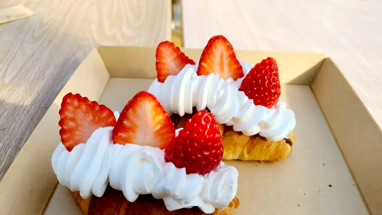ミニカフェも併設しており、いろんなスイーツも楽しめます。お邪魔した日は「いちごクレープ」と「いちごとあんこのクロワッサン」をいただきました。