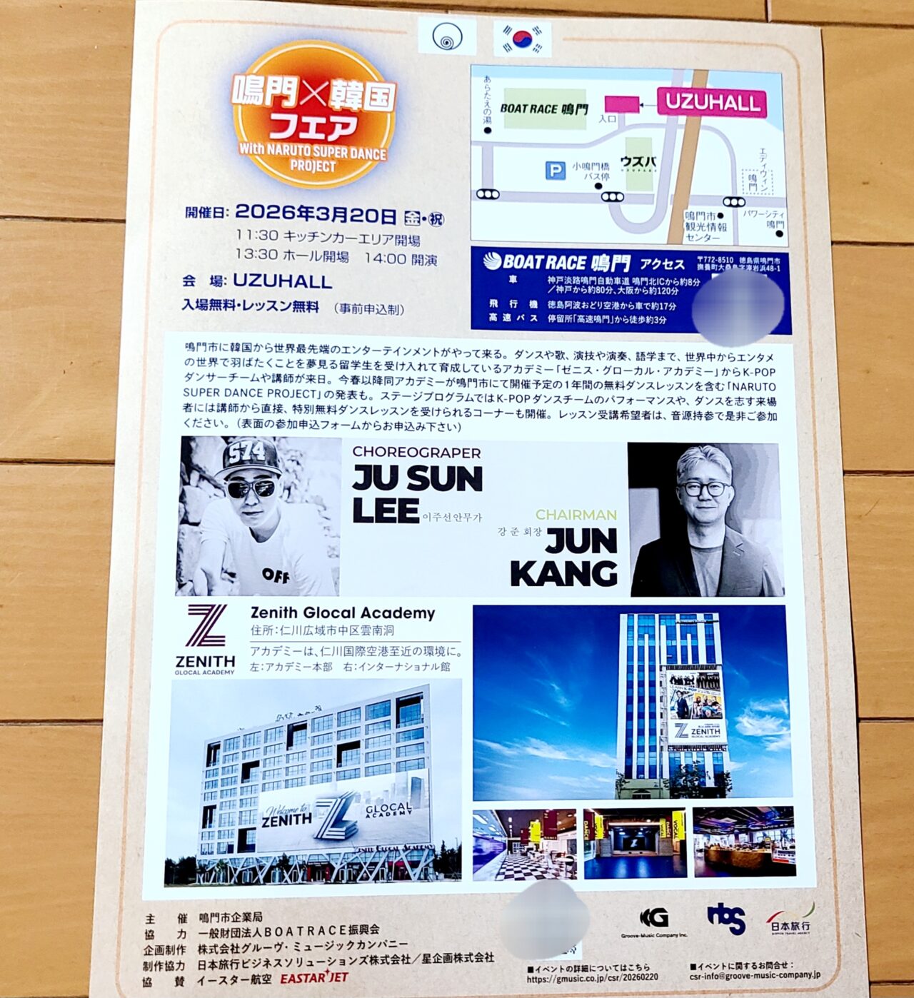 鳴門×韓国フェア@UZUHALL開催日時は、2026年3月20日(金・祝)、キッチンカーエリア開場11:30、ホール開場13:30、開演14:00となります。場所は「ボートレース鳴門 UZUHALL」です。