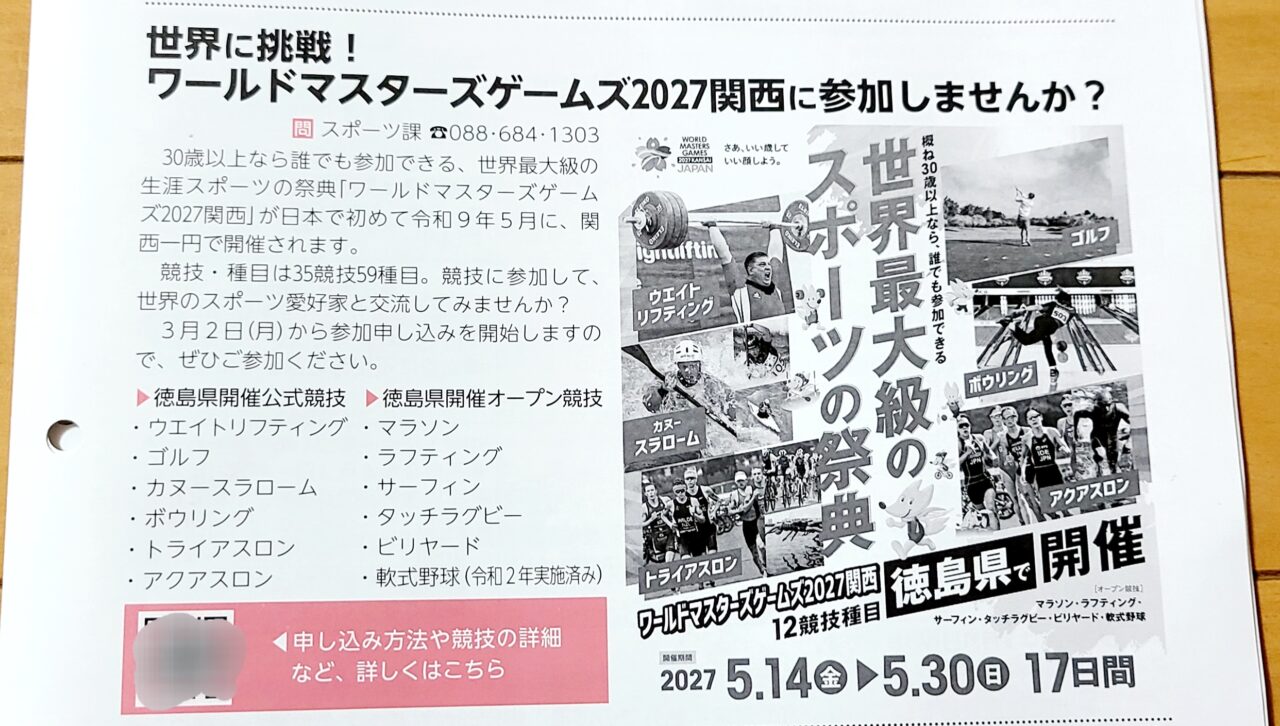 これは、30歳以上なら誰でも参加できる世界最大級の生涯スポーツの祭典です。競技・種目は35競技59種目だそうです。関西一円で開催されるのですが、このうち12競技種目が「徳島県」で開催されます。
